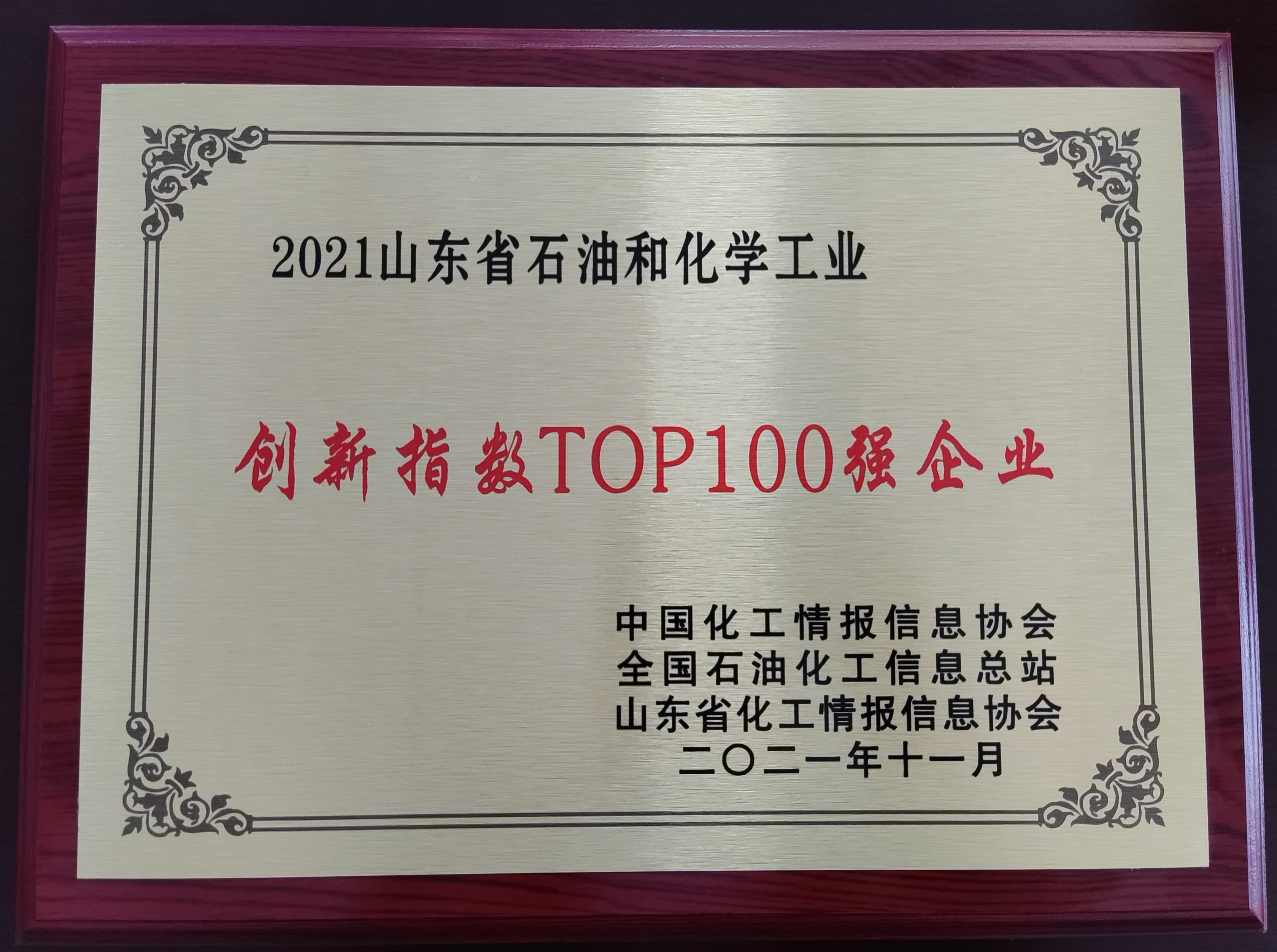 11月23日至24日,由山東省化工情報信息協(xié)會主辦的2021(第十一屆)中國化工產(chǎn)學(xué)研高峰論壇在東營廣饒召開。論壇峰會舉行了“2021化工年度精英人物暨明星單位”頒獎盛典,發(fā)布了“2021山東省石油和化學(xué)工業(yè)創(chuàng)新指數(shù)top100企業(yè)”榜單。集團公司榮獲“2021山東省石油和化學(xué)工業(yè)創(chuàng)新指數(shù)top100企業(yè)”稱號。